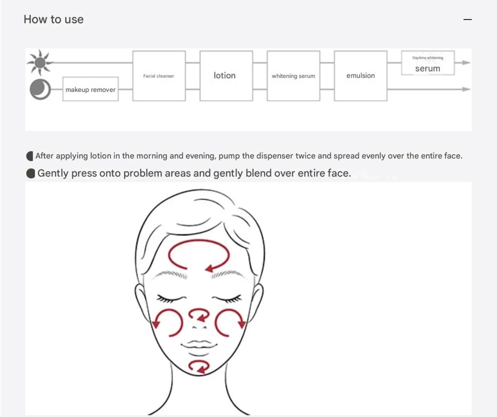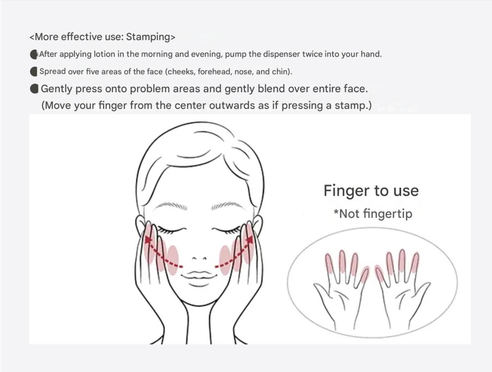早晚化妝水後,按壓兩下的份量,均勻塗抹於全臉。針對在意部位可重點加強使用。