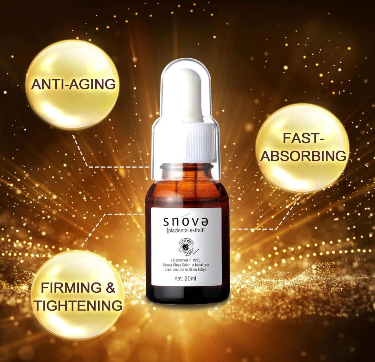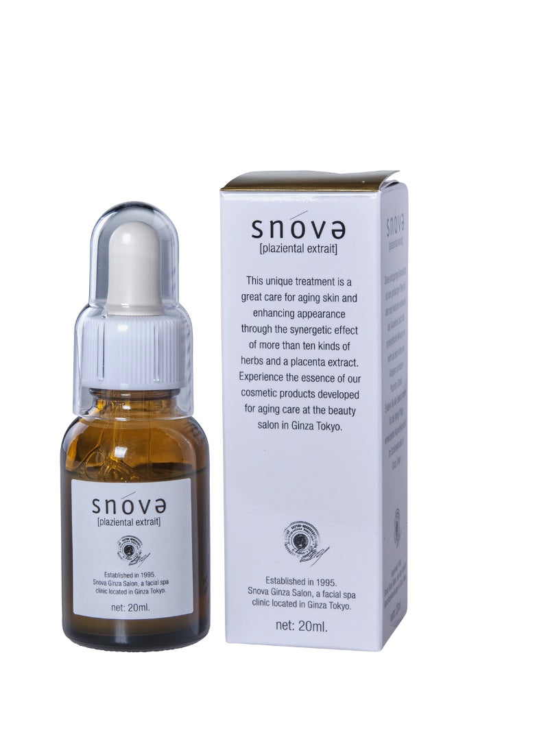 Snova護膚系列中最受歡迎的美容精華液Prazenthal Extra由31%的未稀釋優質胎盤素組成。「發酵熟成胎盤素」是一種非常稀有的胎盤素,是透過冷凍酶提取的製造技術提取未稀釋的胎盤素,然後進一步「發酵」以增加美膚成分而製成的。深入滲透至肌膚角質層,令肌膚緊緻滋潤。具有高保濕力和滲透力的精華液。