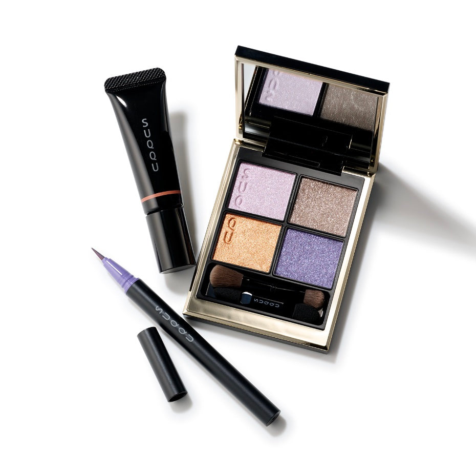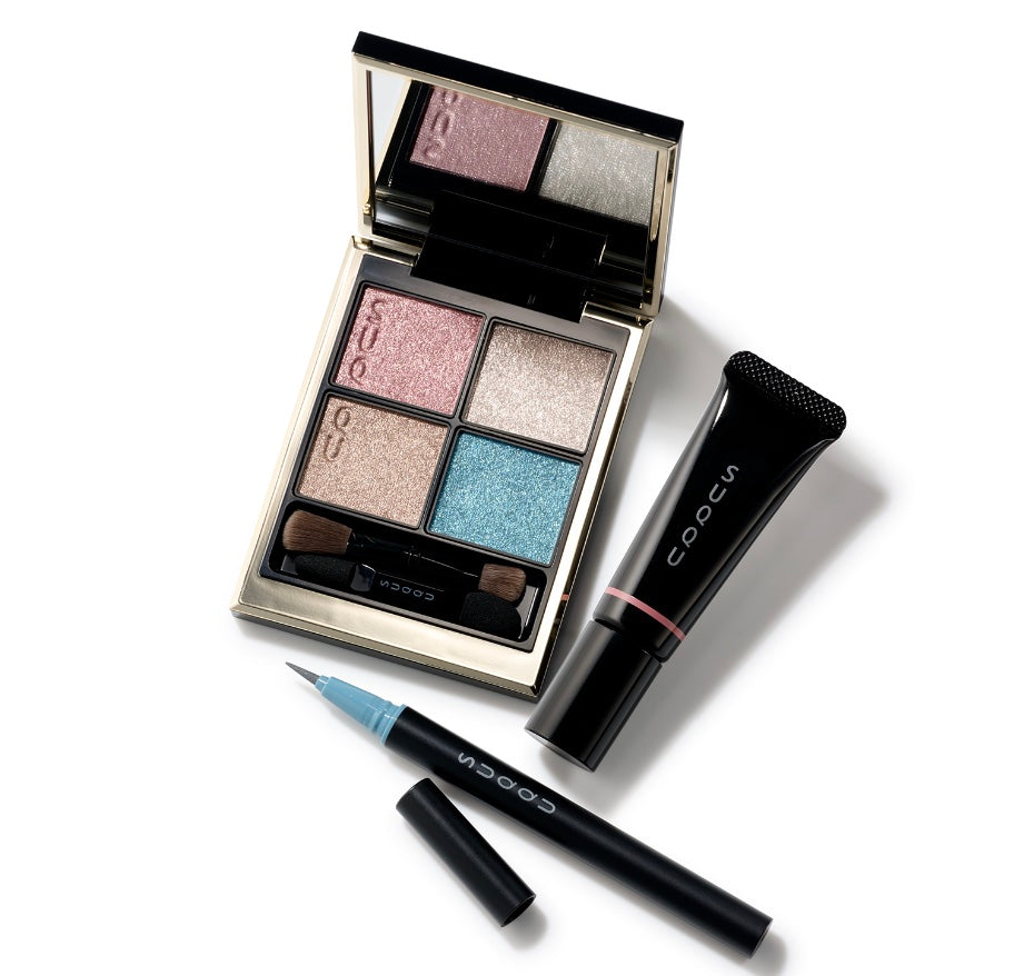 冬季獨有的美麗「銀」色世界,呈現於六花彩妝組合中。這套組合展現了SUQQU的代表性眼影盤,以及可以自如調節粗細在眼部塗抹細微色彩的眼線筆,還有以水潤光澤質感輕柔綻放色彩的潤澤腮紅,營造出一片清澈的美麗世界。
